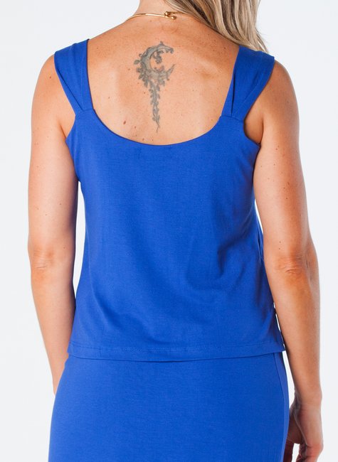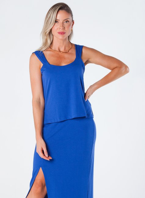 Esta blusa de viscolycra é uma peça elegante e confortável, projetada para ser versátil e sofisticada. Com alça larga, detalhe em pregas e pequena abertura lateral na barra, é ideal para ocasiões casuais ou formais.