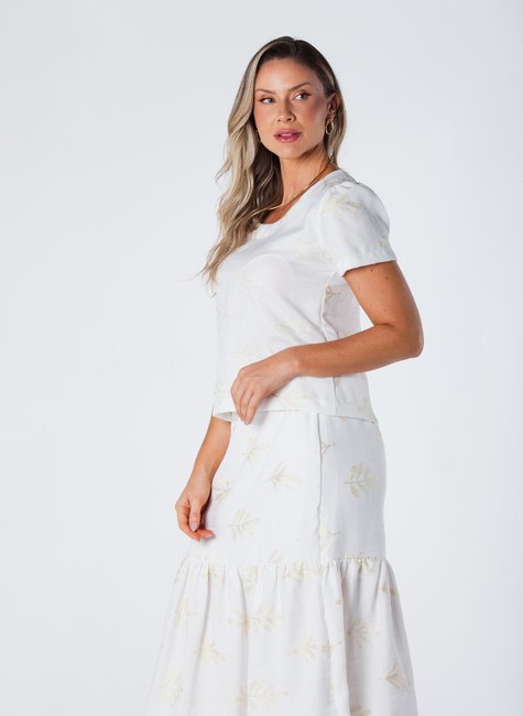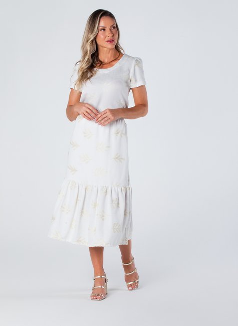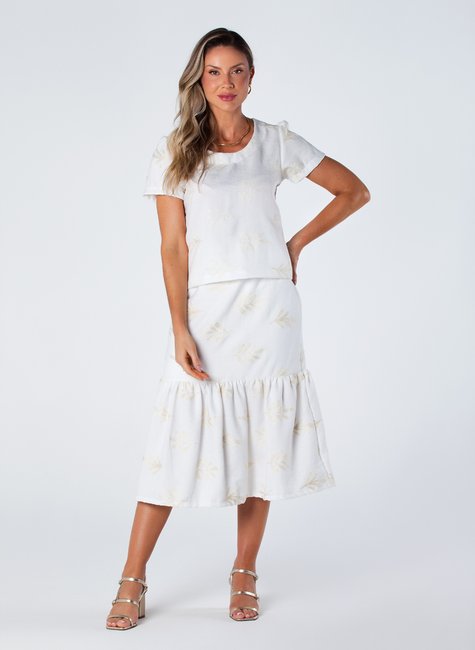 -45%Saia Midi em Tecido Bordado com Barra de Babado e Elástico na Cintura Off White Elisade R$ 228,90 porR$ 120,56 no PIX