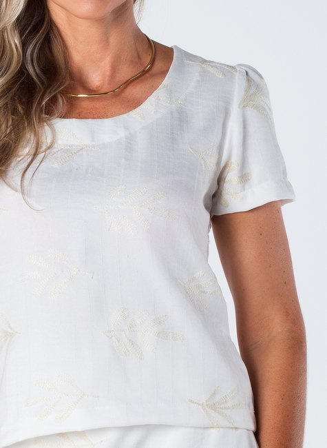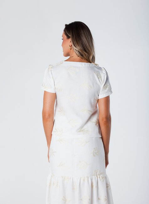 Feminilidade: O tecido bordado e a manga franzida adicionam um toque de feminilidade.