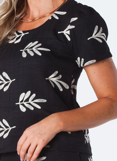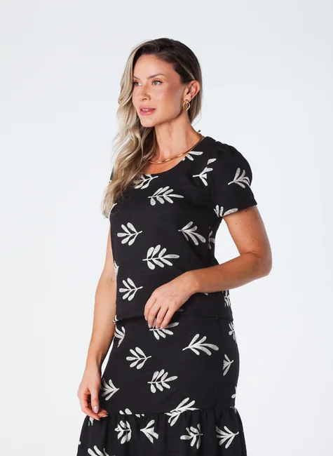 Feminilidade: O tecido bordado e a manga franzida adicionam um toque de feminilidade.