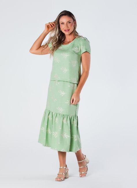 -45%Saia Midi em Tecido Bordado com Barra de Babado e Elástico na Cintura Verde Elisade R$ 228,90 porR$ 120,56 no PIX