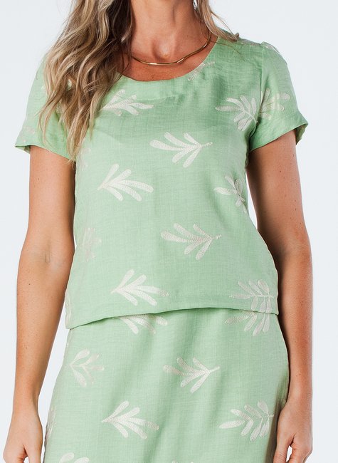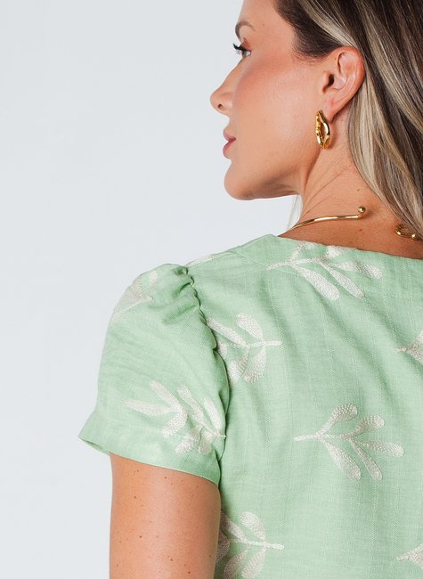 Feminilidade: O tecido bordado e a manga franzida adicionam um toque de feminilidade.