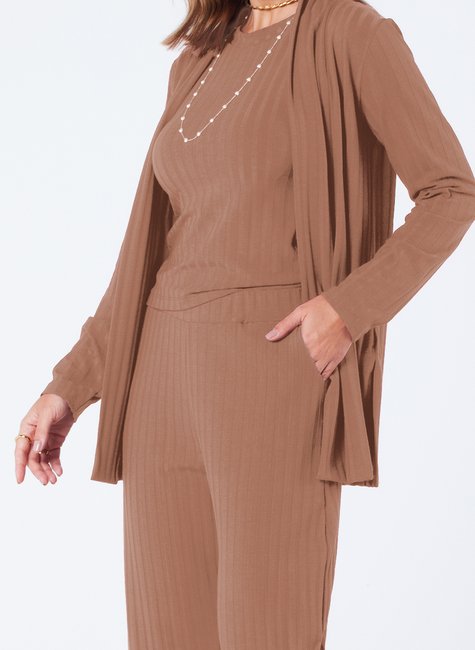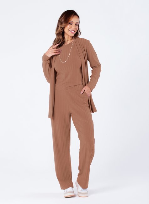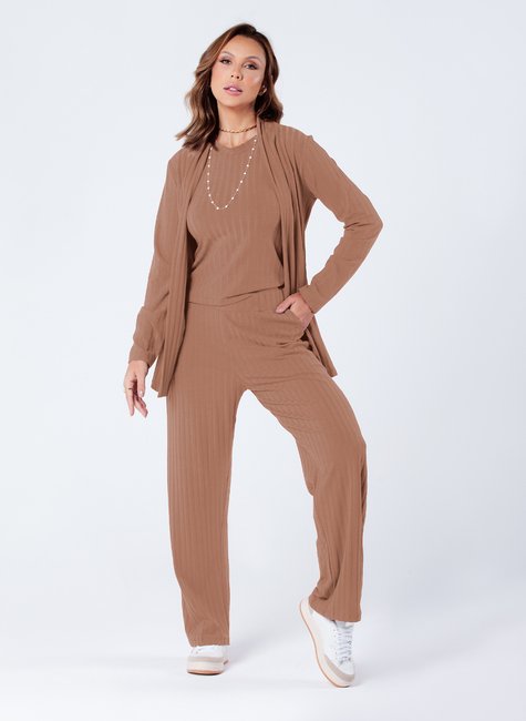 Este conjunto twin set e calça de ribana canelada é super elegante e confortável, perfeito para quem busca uma roupa que combine estilo e praticidade. Com cardigã, regata e calça, é ideal para ocasiões casuais ou simplesmente para um dia a dia mais elegante.