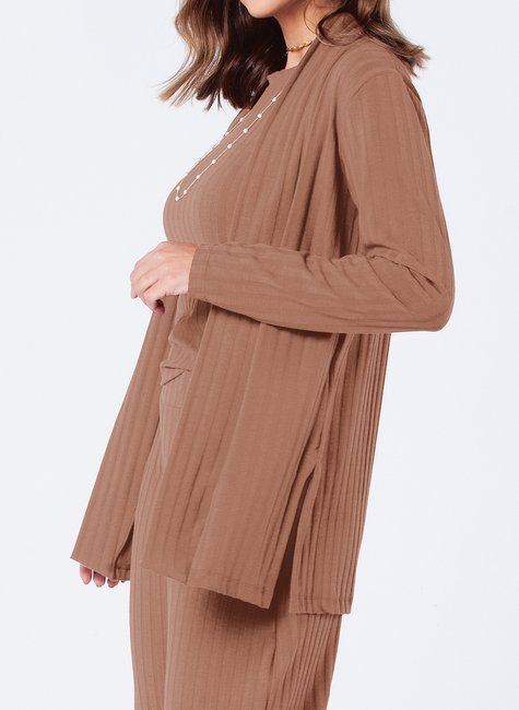Tecido: Ribana canelada, proporcionando textura e elegância.