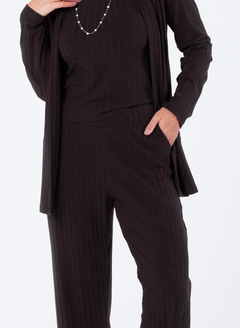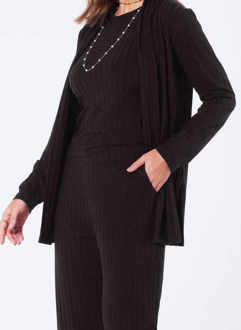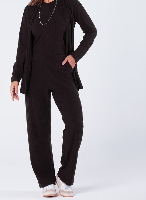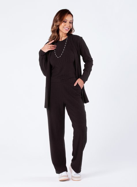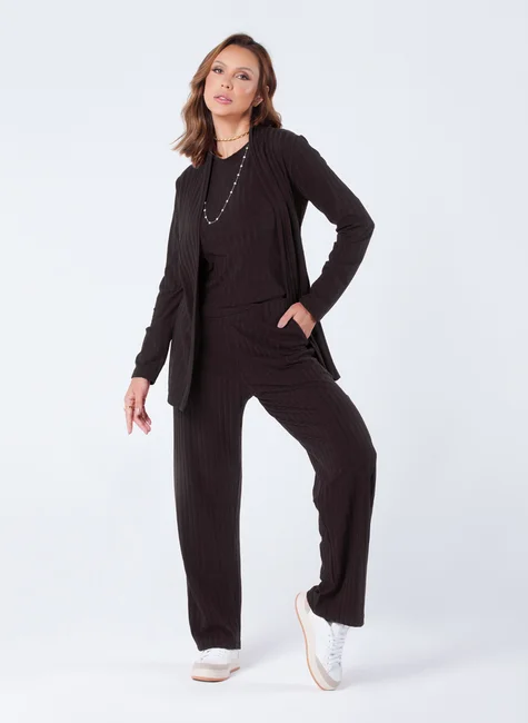 Este conjunto twin set e calça de ribana canelada é super elegante e confortável, perfeito para quem busca uma roupa que combine estilo e praticidade. Com cardigã, regata e calça, é ideal para ocasiões casuais ou simplesmente para um dia a dia mais elegante.