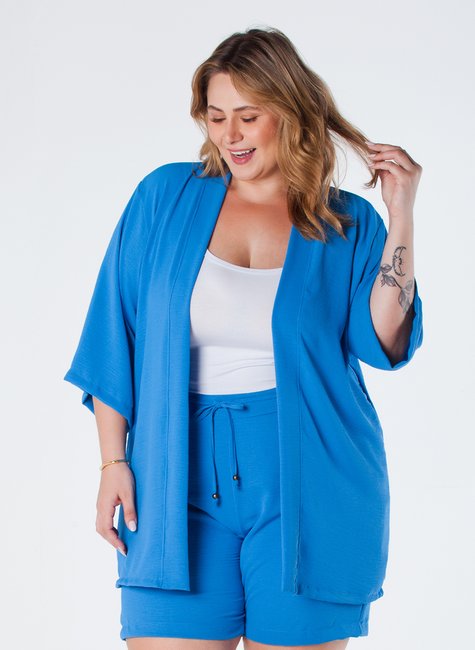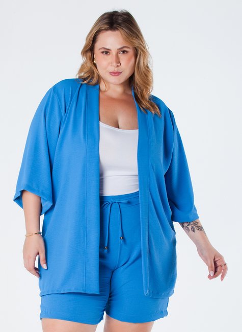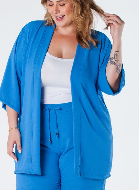 Este kimono de crepe plus size é uma peça elegante e sofisticada, projetada para realçar a beleza feminina em todos os tamanhos. Com barra reta e manga 3/4, é ideal para ocasiões casuais ou formais.