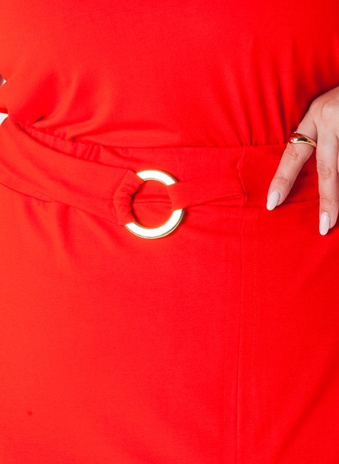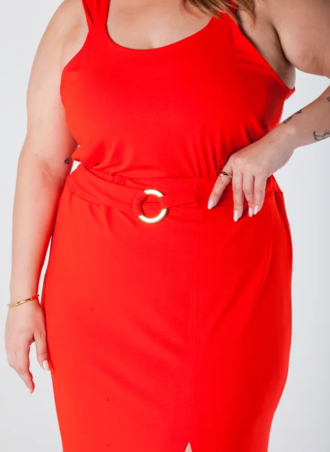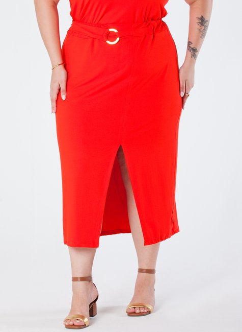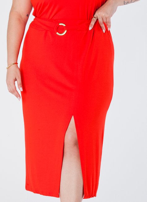 Esta saia midi plus size é uma peça elegante e confortável, projetada para ser versátil e sofisticada. Com fenda frontal, cintura com elástico e cinto com argola decorativa dourada, é ideal para ocasiões casuais ou formais.