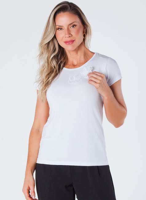A T-shirt baby look com flores de voil aplicadas é uma peça leve e delicada, perfeita para o verão. Confeccionada em viscolycra, oferece um caimento confortável e fresquinho, ideal para os dias mais quentes.