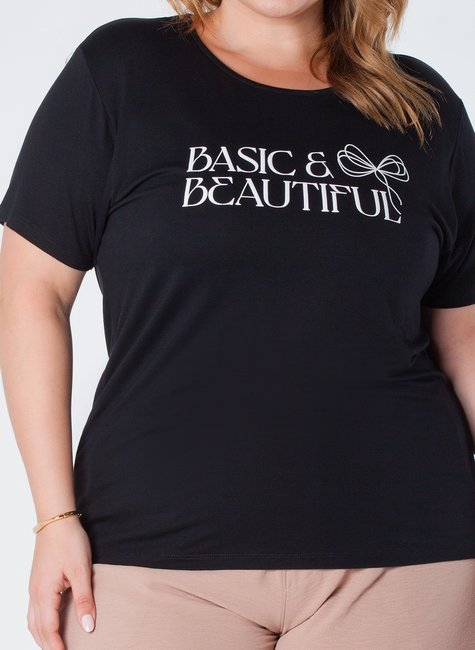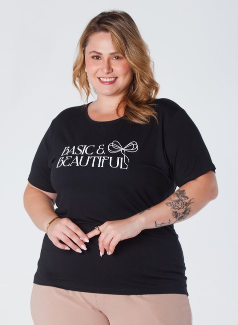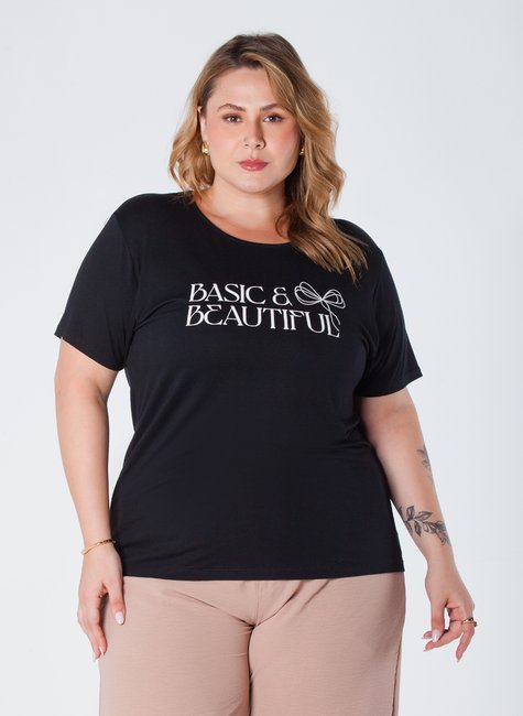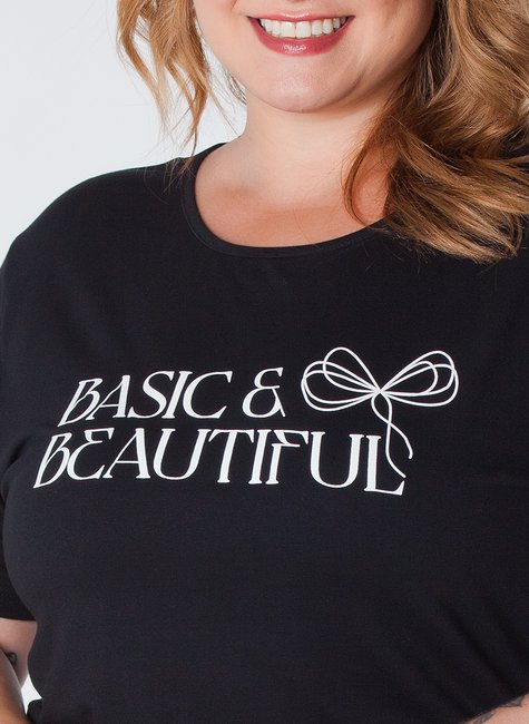 Esta blusa t-shirt baby look plus size de viscolycra é uma peça confortável e elegante, projetada para realçar a beleza feminina em todos os tamanhos. Com estampa "Basic and Beautiful", é ideal para ocasiões casuais e do dia a dia.