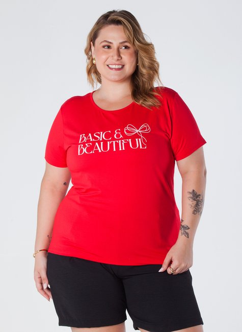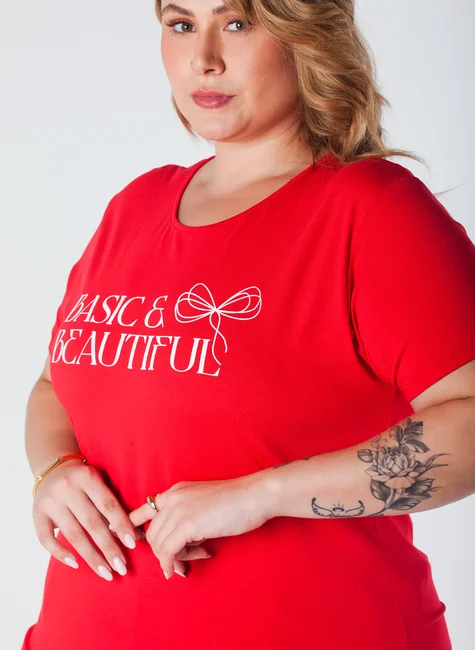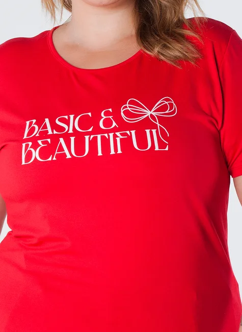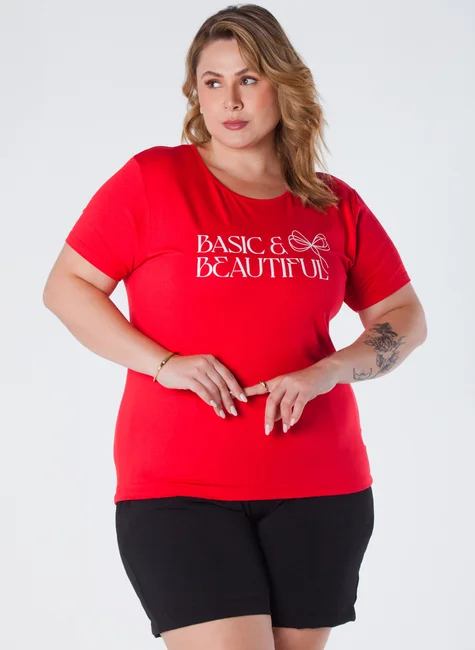 Esta blusa t-shirt baby look plus size de viscolycra é uma peça confortável e elegante, projetada para realçar a beleza feminina em todos os tamanhos. Com estampa "Basic and Beautiful", é ideal para ocasiões casuais e do dia a dia.