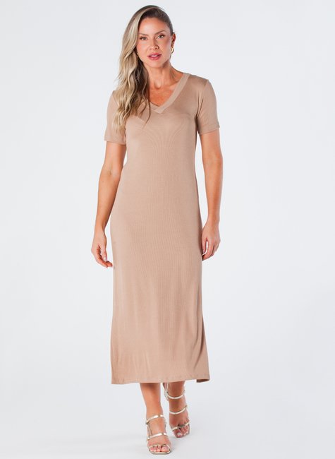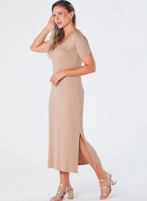 Vestido Midi Gola V com Manga e Fendas Laterias Canelado Bege Teresa